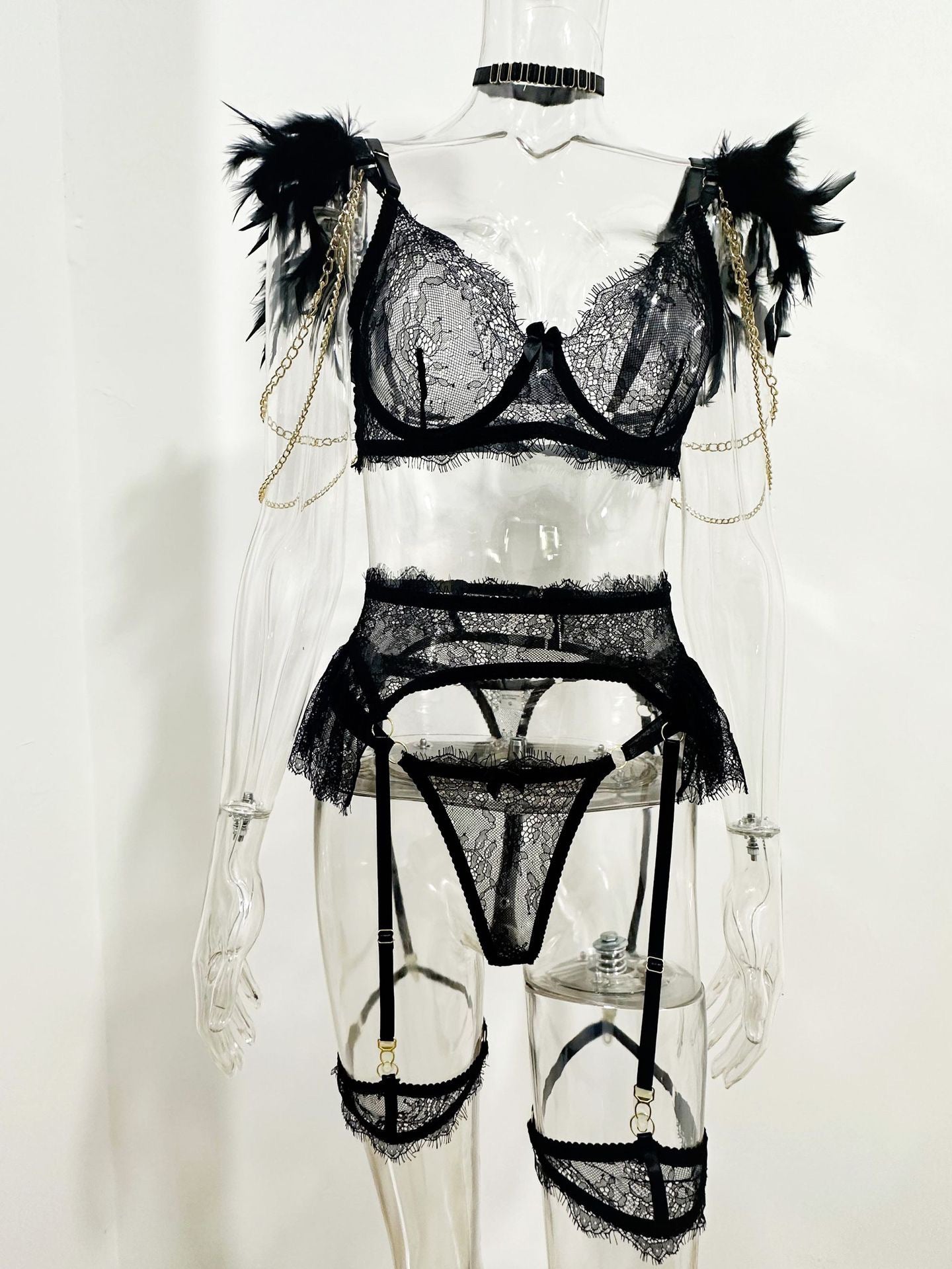 Osez un style spectaculaire avec cet ensemble lingerie en dentelle noire, sublimé par des épaules à plumes et des chaînes dorées. Ce set 4 pièces comprend un soutien-gorge en dentelle, un string assorti, un porte-jarretelles et des jarretières, pour une allure sensuelle et inoubliable.